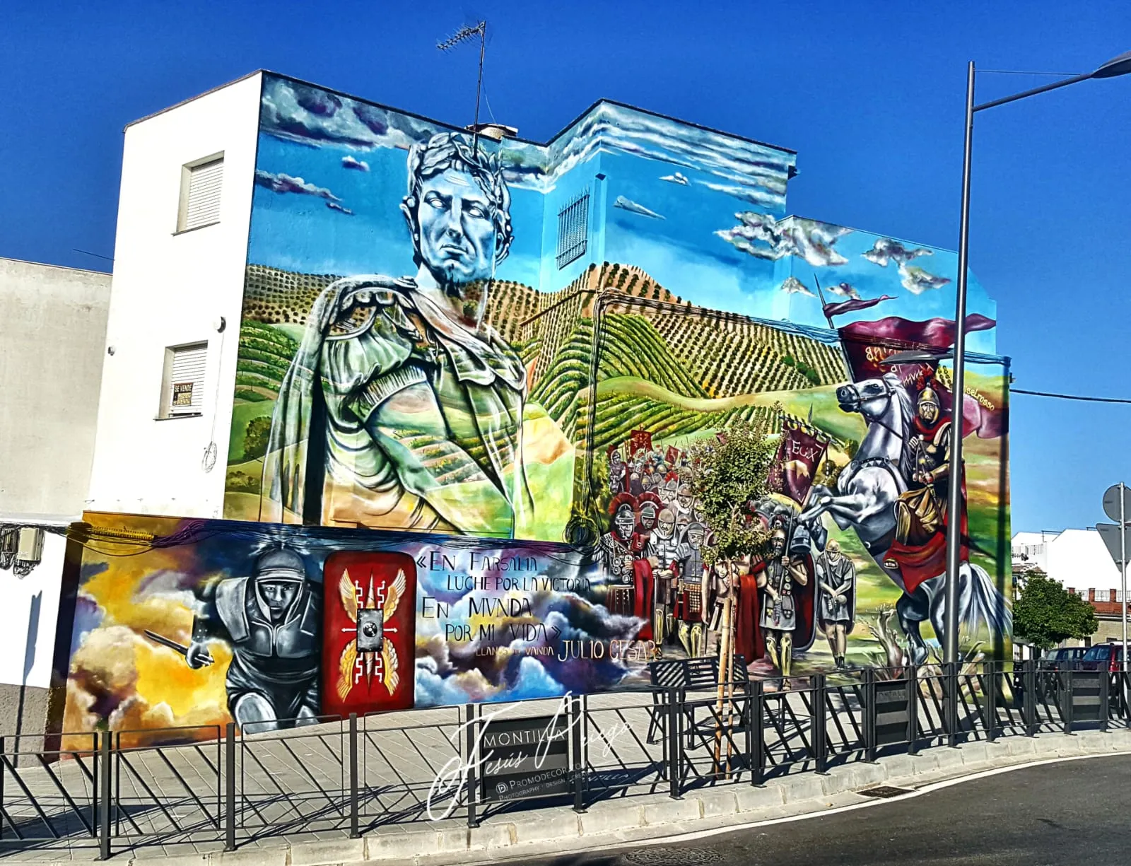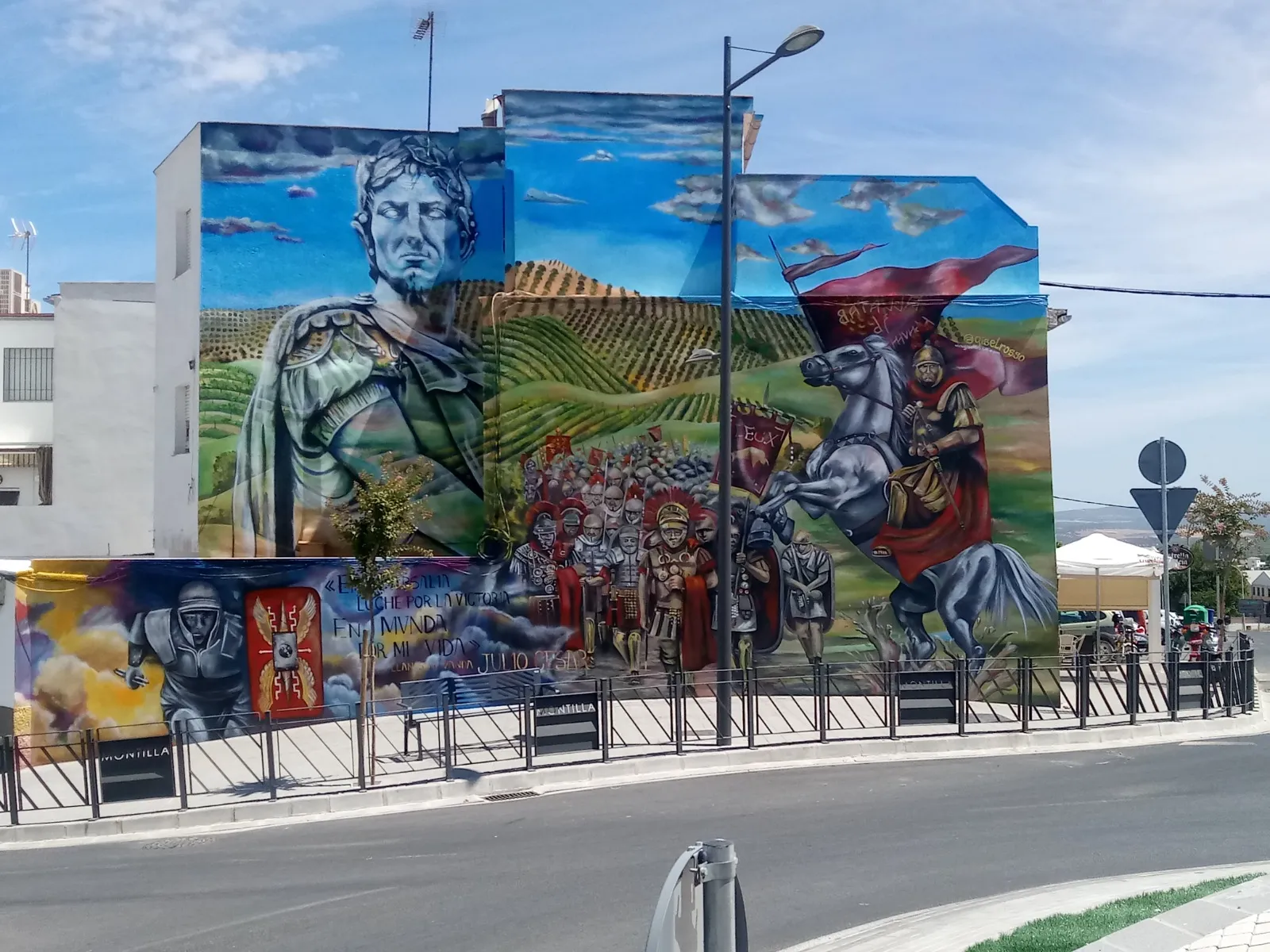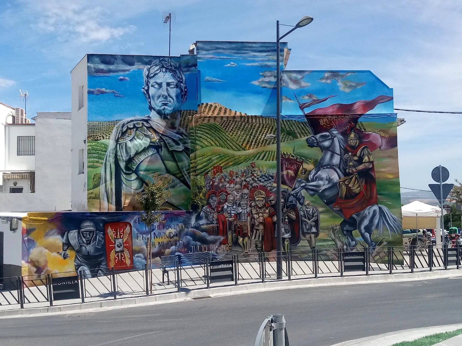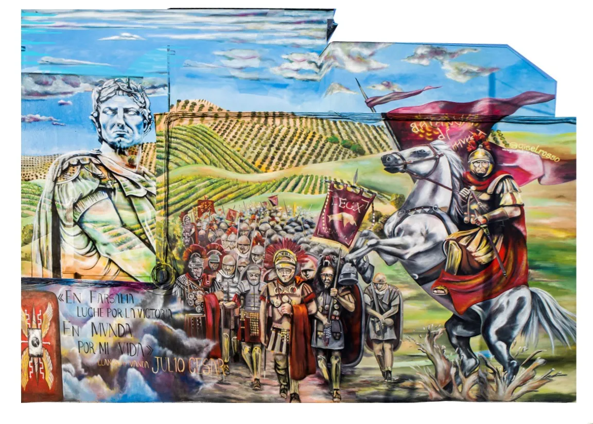 En Montilla, donde la tierra respira historia y los viñedos se extienden como un manto ancestral, este mural nos transporta a los días de Julio César y la legendaria batalla de Munda. Sobre el muro, la figura de César se funde en transparencia con los viñedos y el ejército, recordándonos que la vida y la memoria se entrelazan más allá del tiempo. Aquí, la batalla no es solo un hecho del pasado: es un símbolo de transformación. Julio César, lejos de luchar solo por el triunfo, nos deja un mensaje profundo: en ciertos momentos, lo que está en juego no es la gloria, sino la vida misma. Cada pincelada honra esa búsqueda, ese pulso vital que atraviesa generaciones y nos invita a mirar más allá de la victoria o la derrota. Al contemplar la obra, sentí el eco de los pasos antiguos sobre la tierra, el murmullo de los viñedos y la fuerza de quienes eligieron vivir y trascender. Este mural consagra la unión entre historia y presente, entre lo humano y lo sagrado, invitándonos a recordar que, como César, todos enfrentamos batallas donde lo esencial es defender la vida, la dignidad y el sentido de pertenencia. Que esta imagen te sane, te inspire a honrar tus propias luchas, a abrazar la tierra que te sostiene y a celebrar la herencia de quienes, como vos, eligieron dejar huella desde el corazón.