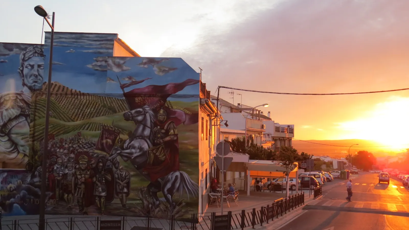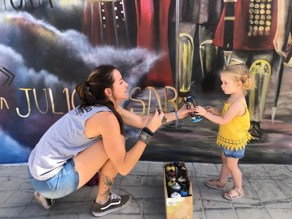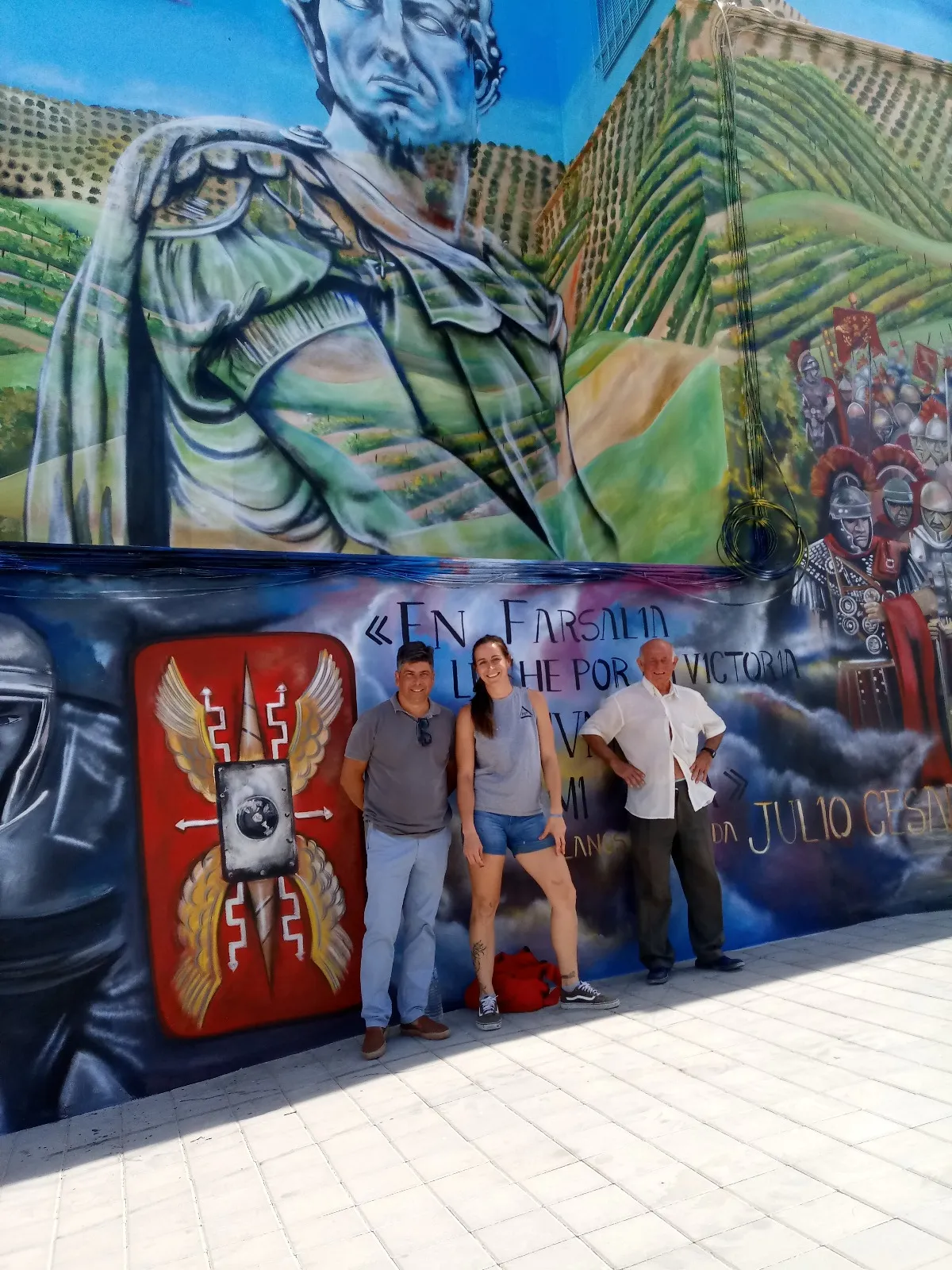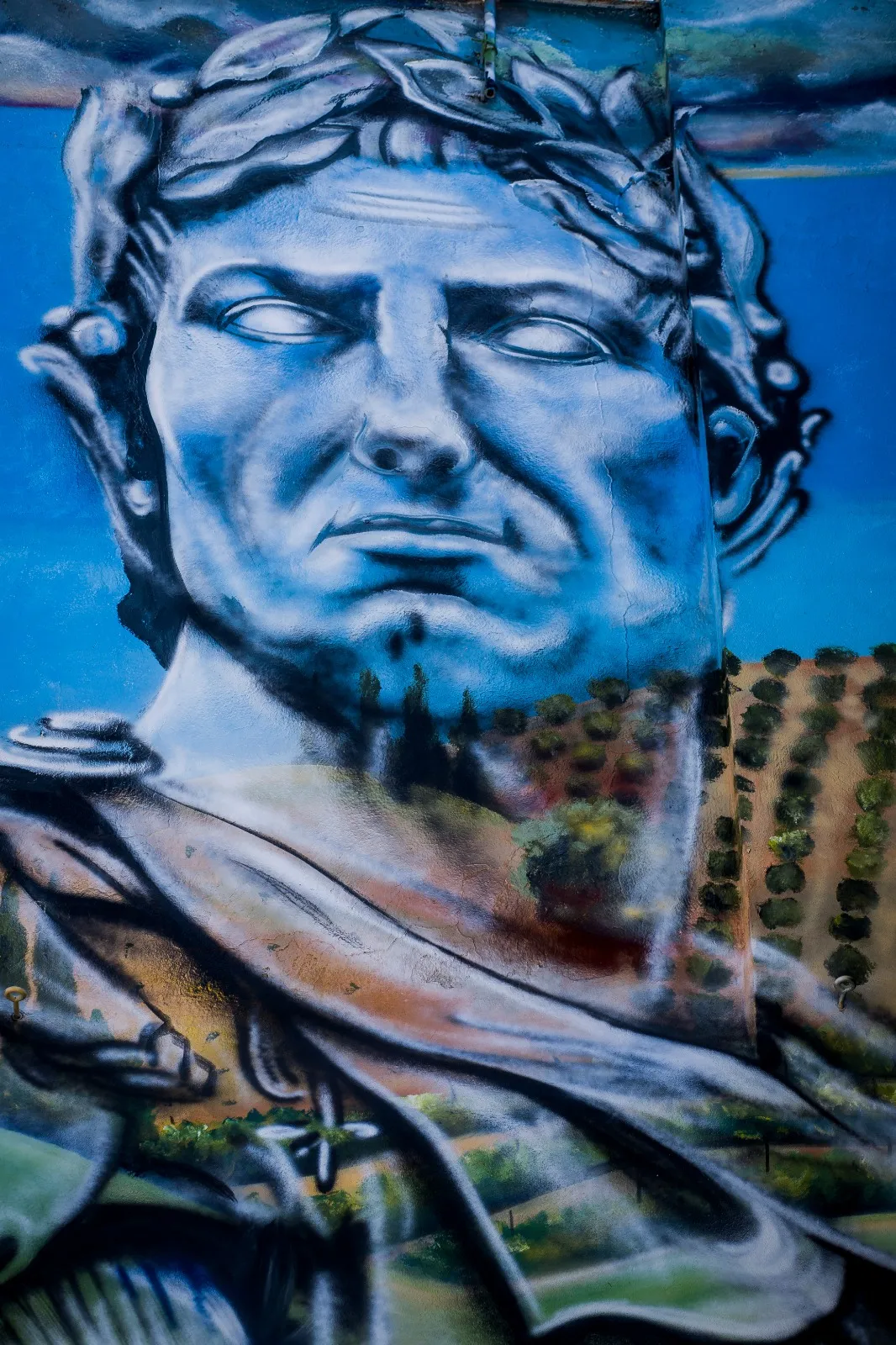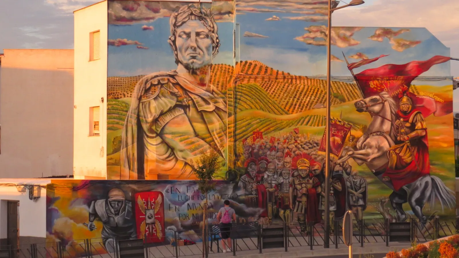 En Montilla, donde la tierra respira historia y los viñedos se extienden como un manto ancestral, este mural nos transporta a los días de Julio César y la legendaria batalla de Munda. Sobre el muro, la figura de César se funde en transparencia con los viñedos y el ejército, recordándonos que la vida y la memoria se entrelazan más allá del tiempo. Aquí, la batalla no es solo un hecho del pasado: es un símbolo de transformación. Julio César, lejos de luchar solo por el triunfo, nos deja un mensaje profundo: en ciertos momentos, lo que está en juego no es la gloria, sino la vida misma. Cada pincelada honra esa búsqueda, ese pulso vital que atraviesa generaciones y nos invita a mirar más allá de la victoria o la derrota. Al contemplar la obra, sentí el eco de los pasos antiguos sobre la tierra, el murmullo de los viñedos y la fuerza de quienes eligieron vivir y trascender. Este mural consagra la unión entre historia y presente, entre lo humano y lo sagrado, invitándonos a recordar que, como César, todos enfrentamos batallas donde lo esencial es defender la vida, la dignidad y el sentido de pertenencia. Que esta imagen te sane, te inspire a honrar tus propias luchas, a abrazar la tierra que te sostiene y a celebrar la herencia de quienes, como vos, eligieron dejar huella desde el corazón.