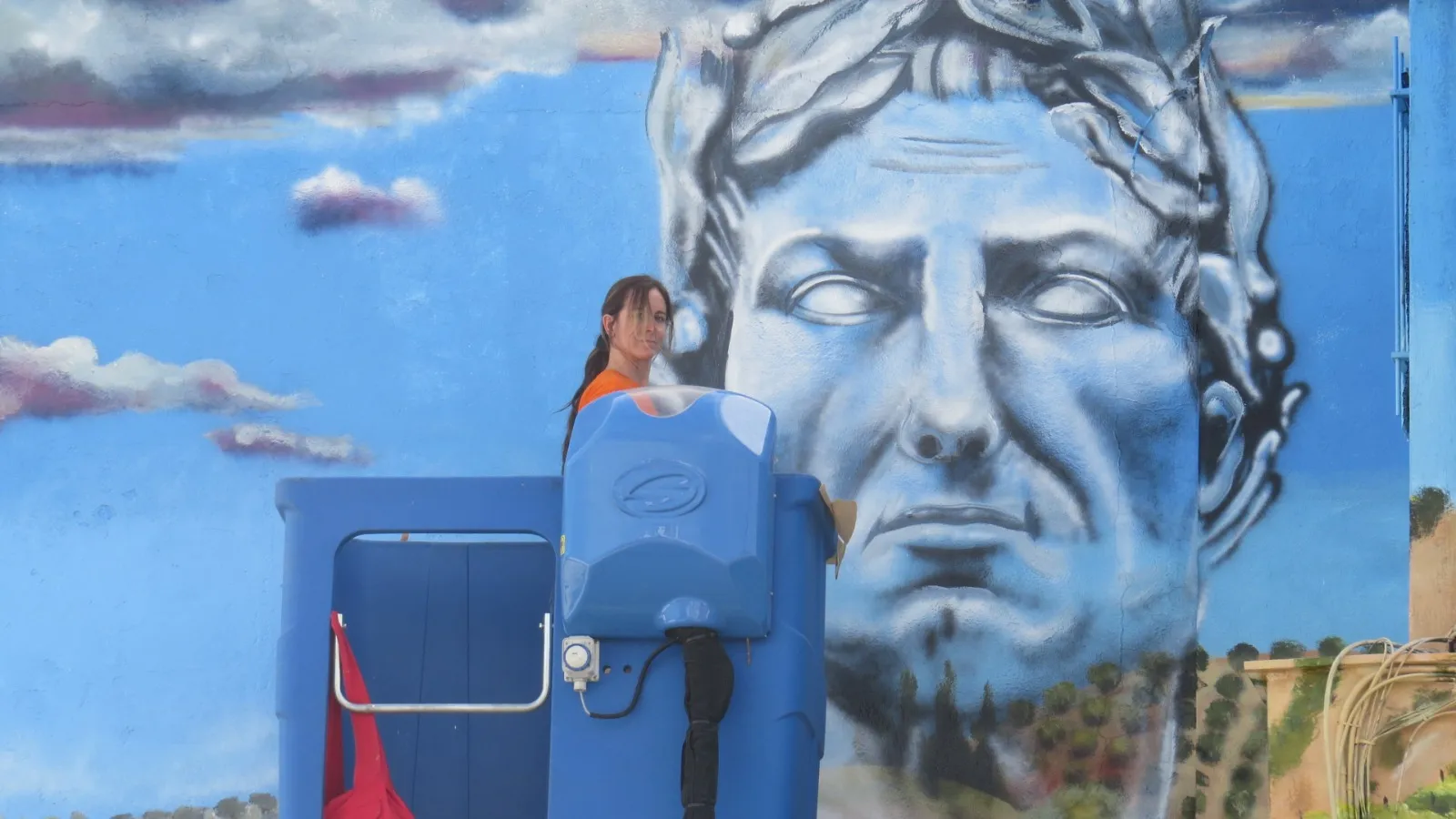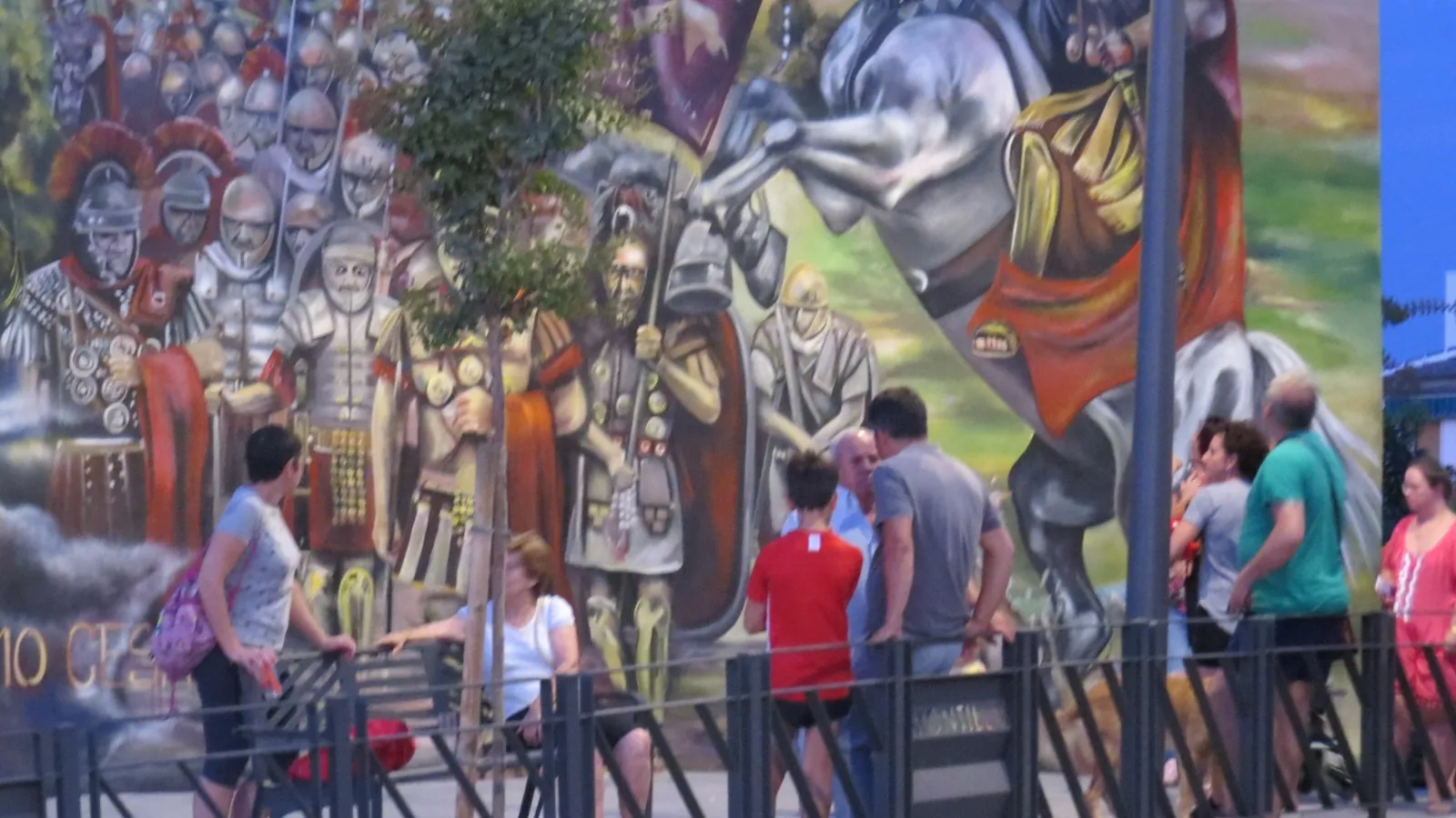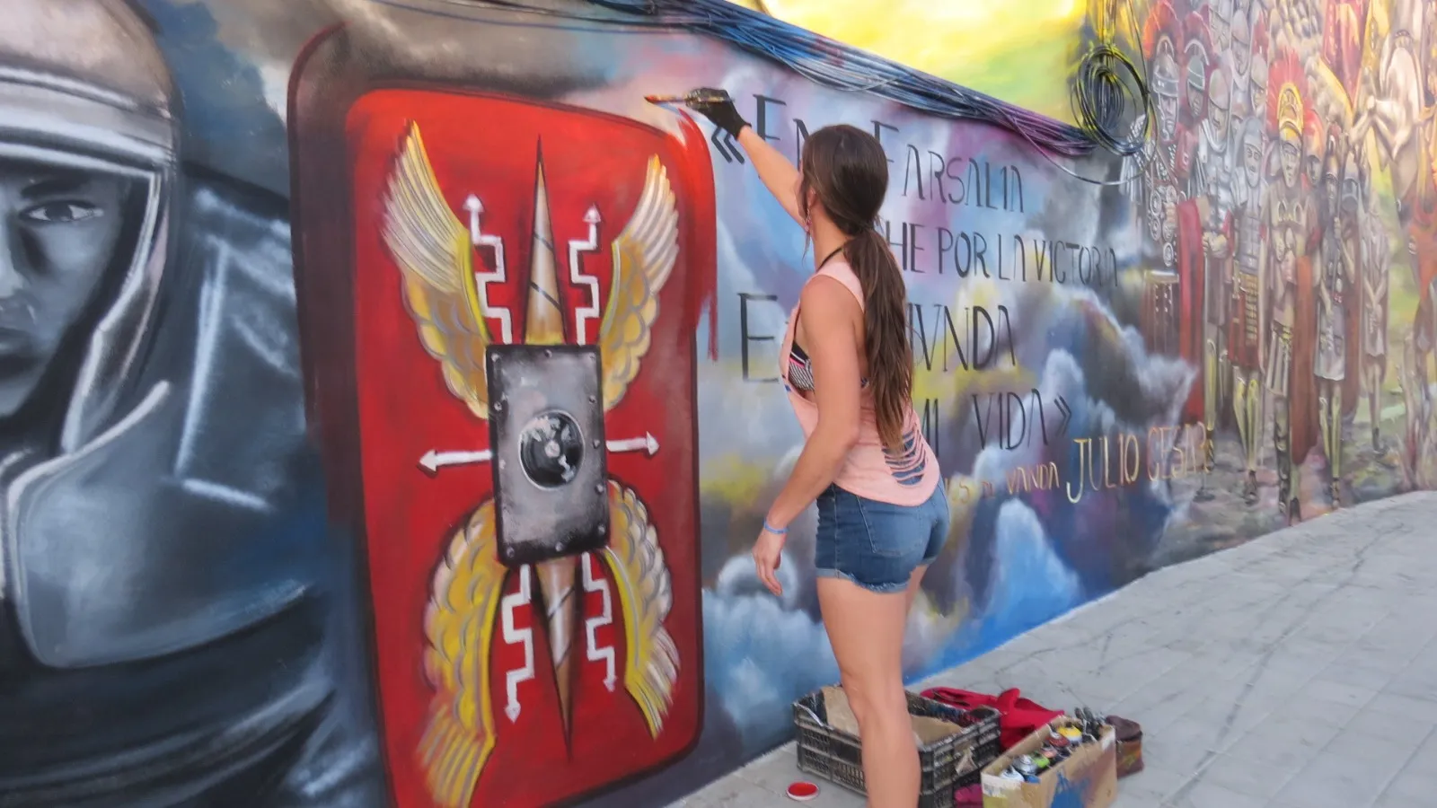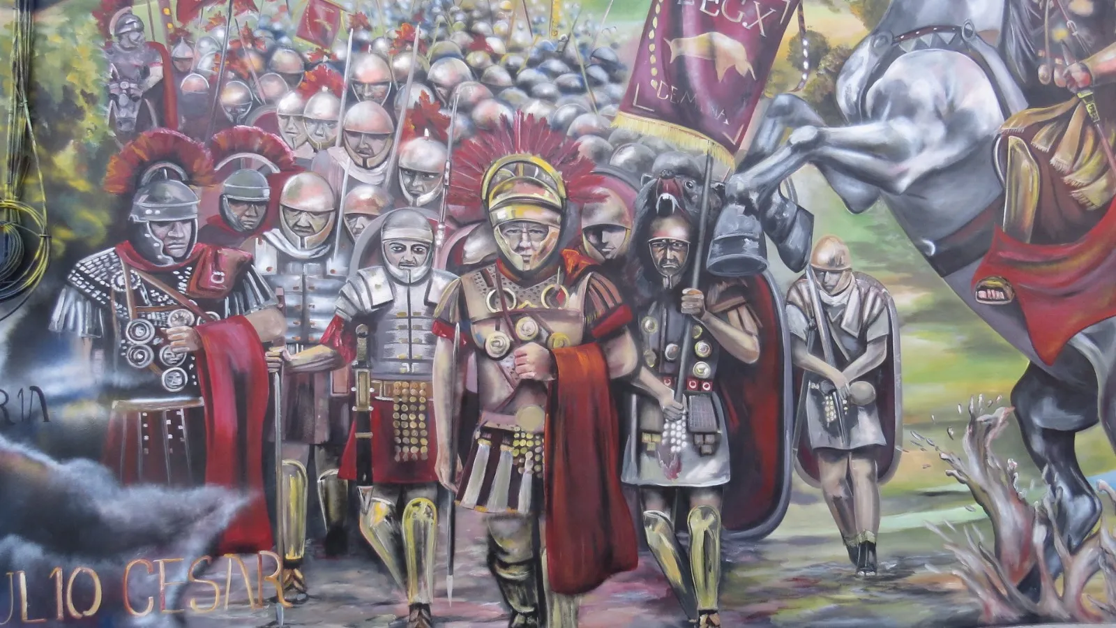 En Montilla, donde la tierra respira historia y los viñedos se extienden como un manto ancestral, este mural nos transporta a los días de Julio César y la legendaria batalla de Munda. Sobre el muro, la figura de César se funde en transparencia con los viñedos y el ejército, recordándonos que la vida y la memoria se entrelazan más allá del tiempo. Aquí, la batalla no es solo un hecho del pasado: es un símbolo de transformación. Julio César, lejos de luchar solo por el triunfo, nos deja un mensaje profundo: en ciertos momentos, lo que está en juego no es la gloria, sino la vida misma. Cada pincelada honra esa búsqueda, ese pulso vital que atraviesa generaciones y nos invita a mirar más allá de la victoria o la derrota. Al contemplar la obra, sentí el eco de los pasos antiguos sobre la tierra, el murmullo de los viñedos y la fuerza de quienes eligieron vivir y trascender. Este mural consagra la unión entre historia y presente, entre lo humano y lo sagrado, invitándonos a recordar que, como César, todos enfrentamos batallas donde lo esencial es defender la vida, la dignidad y el sentido de pertenencia. Que esta imagen te sane, te inspire a honrar tus propias luchas, a abrazar la tierra que te sostiene y a celebrar la herencia de quienes, como vos, eligieron dejar huella desde el corazón.