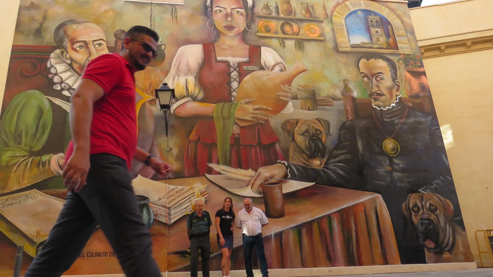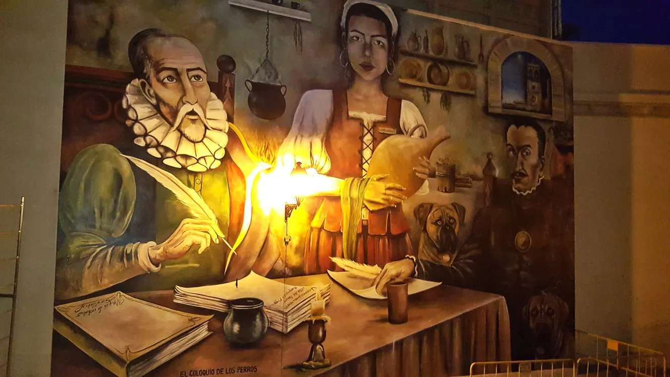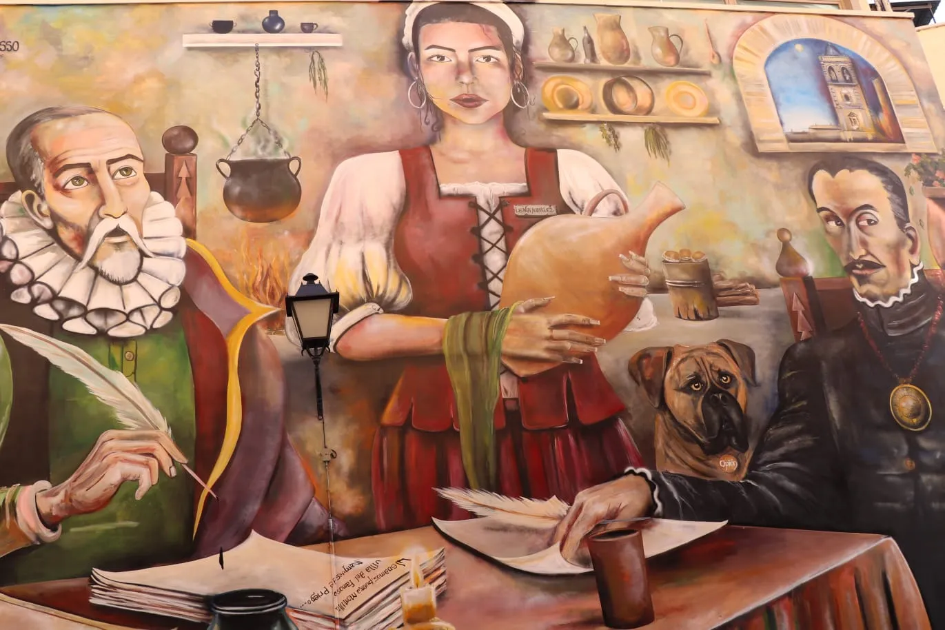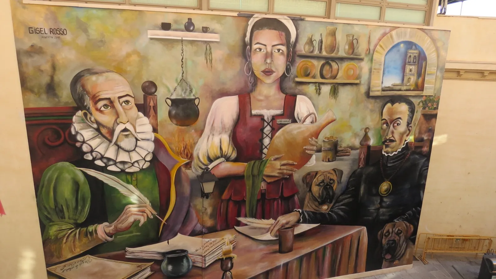 En la Plaza de la Rosa, el Teatro Garnelo guarda un secreto entre sus muros: un encuentro imposible, pero profundamente real en el arte. “El coloquio de los perros”, mural nacido en 1917 y renacido en ésta obra en 2019, invita a viajar a una posada de otros tiempos, donde Miguel de Cervantes y El Inca Garcilaso de la Vega comparten mesa y palabras. Los une la curiosidad, la búsqueda y el deseo de comprender el alma humana. Sirviendo la mesa está la Camacha, Leonor Rodríguez, la hechicera de Montilla, mujer acusada de brujería por ver más allá de su época, por escuchar a la naturaleza y desafiar los límites de lo permitido. Su presencia es un acto de reivindicación: la sabiduría y la intuición, tantas veces señaladas como locura o peligro, aquí se celebran y se honran. La escena vibra con magia y humanidad. Cada gesto, cada mirada, cada objeto sobre la mesa habla de la diversidad y el valor de ser distinto. El mural invita a preguntarnos: ¿qué veo en el otro que también es mío? ¿Qué sombra proyecto cuando juzgo afuera lo que no acepto en mí? Esta obra es un puente entre siglos, una invitación a reconocernos como seres de luz, valiosos y perfectos en nuestra diferencia. Nos recuerda que nadie está “errado” por sentir, pensar o soñar distinto. Todo importa, todo suma, todo es parte de una historia más grande. Al contemplar el mural, la magia se revela: la Camacha ya no es solo una hechicera, sino la voz de quienes se animan a mirar más allá, a escuchar la melodía de la vida ya abrazar su propia rareza. El Teatro Garnelo se convierte así en un espacio de encuentro, de preguntas profundas y de celebración de lo auténtico. Al contemplar esta obra cada persona se lleva la certeza de que su luz —única, irrepetible— también merece ser vista y honrada.