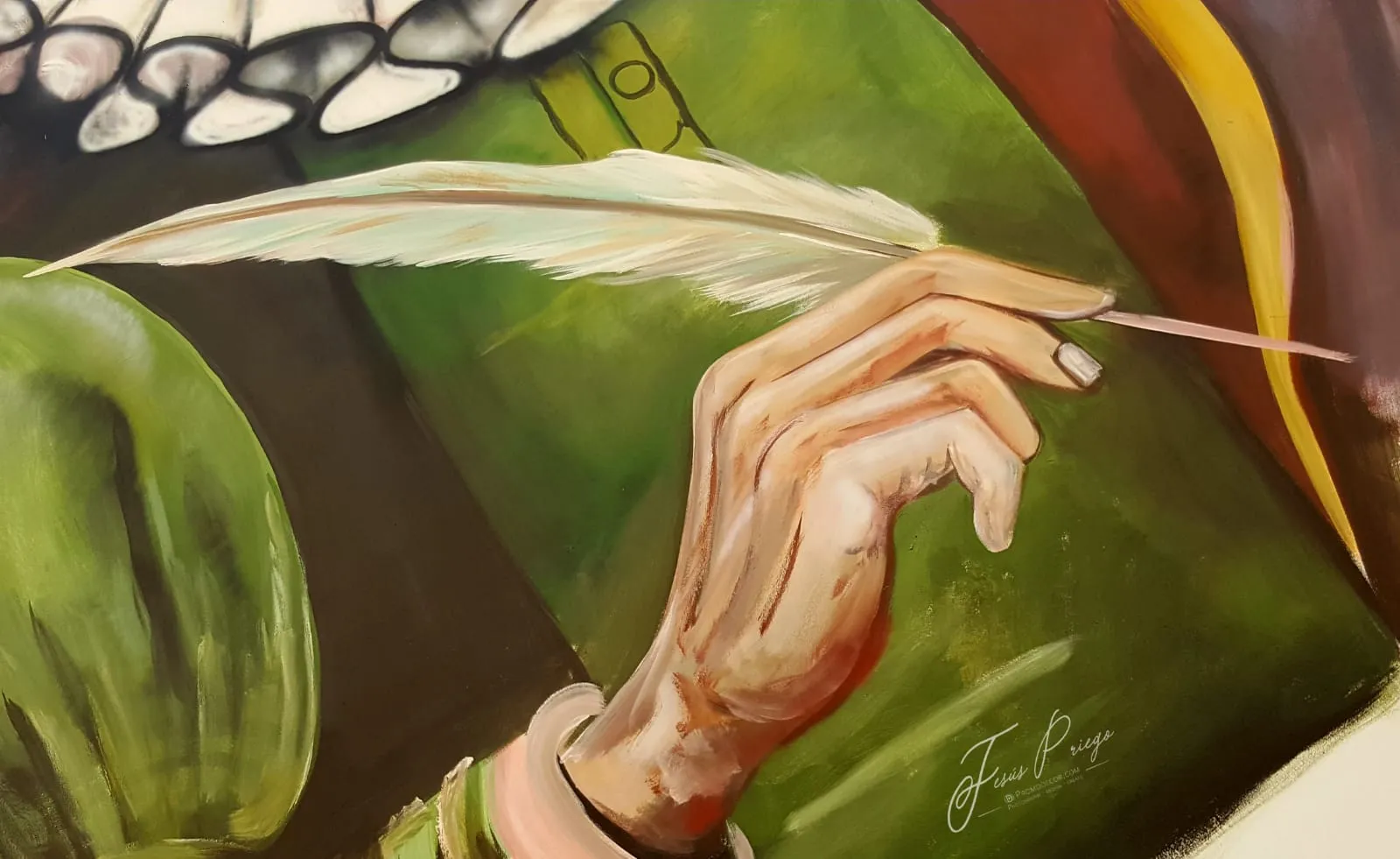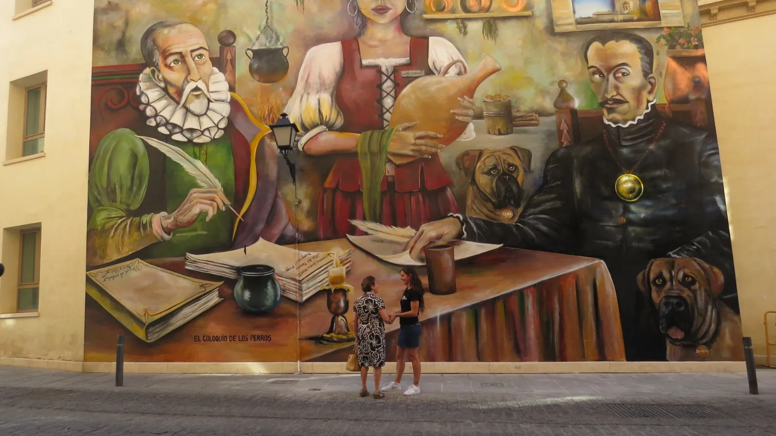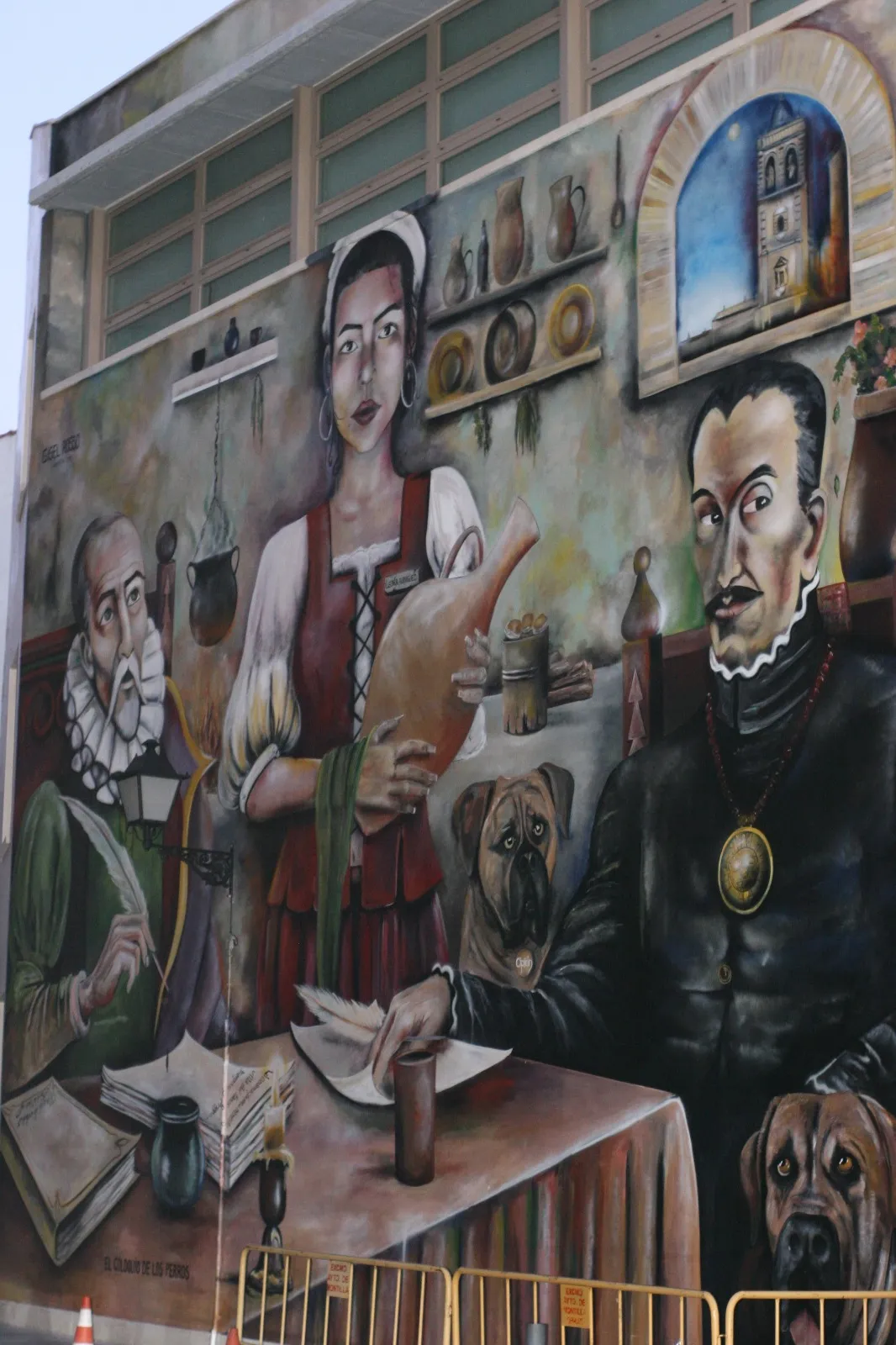 En la Plaza de la Rosa, el Teatro Garnelo guarda un secreto entre sus muros: un encuentro imposible, pero profundamente real en el arte. “El coloquio de los perros”, mural nacido en 1917 y renacido en ésta obra en 2019, invita a viajar a una posada de otros tiempos, donde Miguel de Cervantes y El Inca Garcilaso de la Vega comparten mesa y palabras. Los une la curiosidad, la búsqueda y el deseo de comprender el alma humana. Sirviendo la mesa está la Camacha, Leonor Rodríguez, la hechicera de Montilla, mujer acusada de brujería por ver más allá de su época, por escuchar a la naturaleza y desafiar los límites de lo permitido. Su presencia es un acto de reivindicación: la sabiduría y la intuición, tantas veces señaladas como locura o peligro, aquí se celebran y se honran. La escena vibra con magia y humanidad. Cada gesto, cada mirada, cada objeto sobre la mesa habla de la diversidad y el valor de ser distinto. El mural invita a preguntarnos: ¿qué veo en el otro que también es mío? ¿Qué sombra proyecto cuando juzgo afuera lo que no acepto en mí? Esta obra es un puente entre siglos, una invitación a reconocernos como seres de luz, valiosos y perfectos en nuestra diferencia. Nos recuerda que nadie está “errado” por sentir, pensar o soñar distinto. Todo importa, todo suma, todo es parte de una historia más grande. Al contemplar el mural, la magia se revela: la Camacha ya no es solo una hechicera, sino la voz de quienes se animan a mirar más allá, a escuchar la melodía de la vida ya abrazar su propia rareza. El Teatro Garnelo se convierte así en un espacio de encuentro, de preguntas profundas y de celebración de lo auténtico. Al contemplar esta obra cada persona se lleva la certeza de que su luz —única, irrepetible— también merece ser vista y honrada.