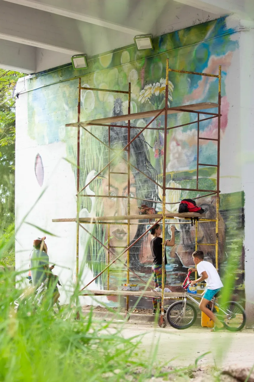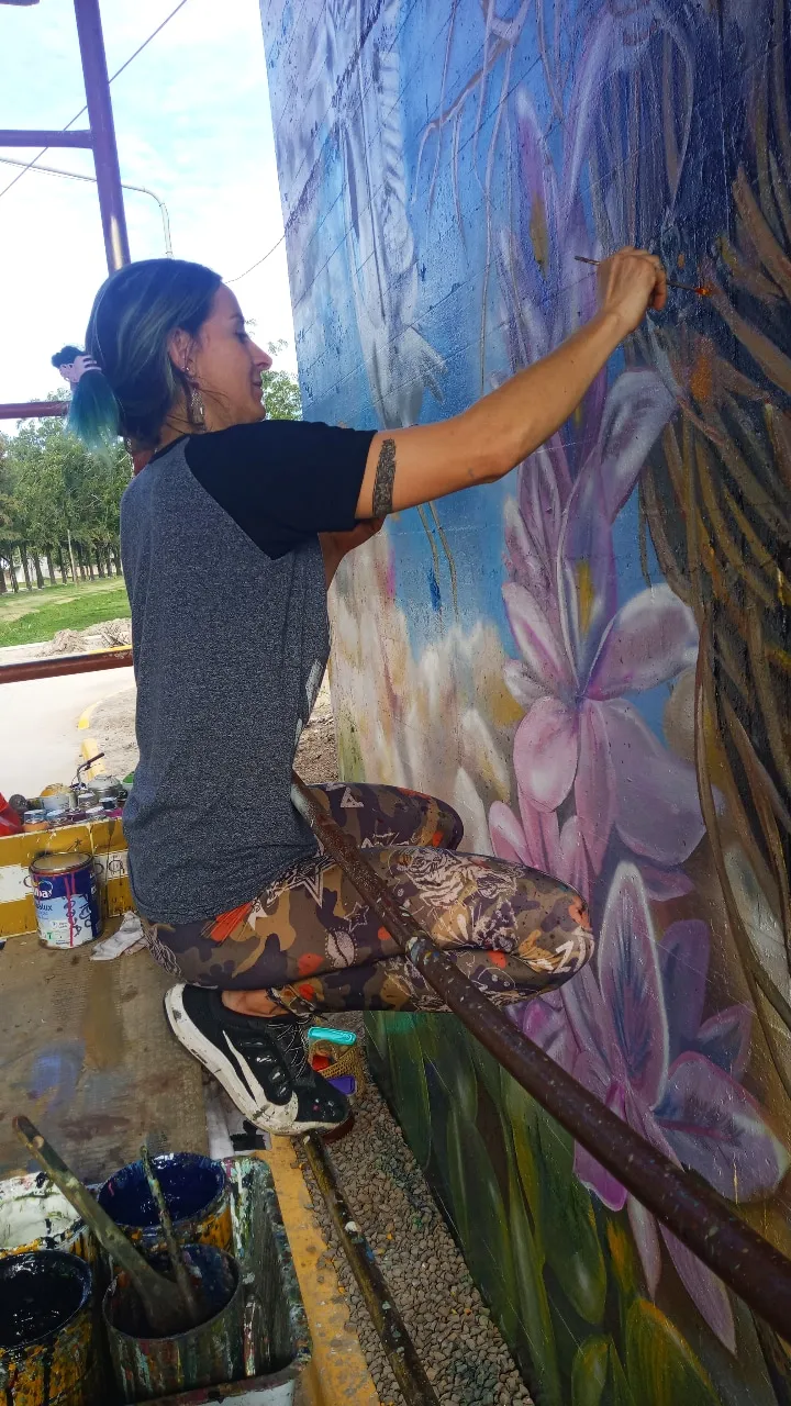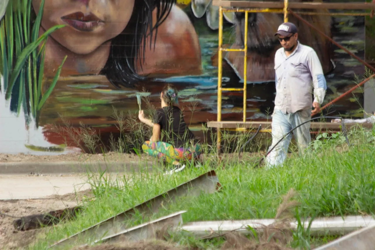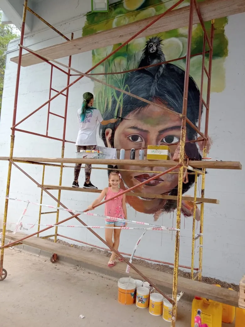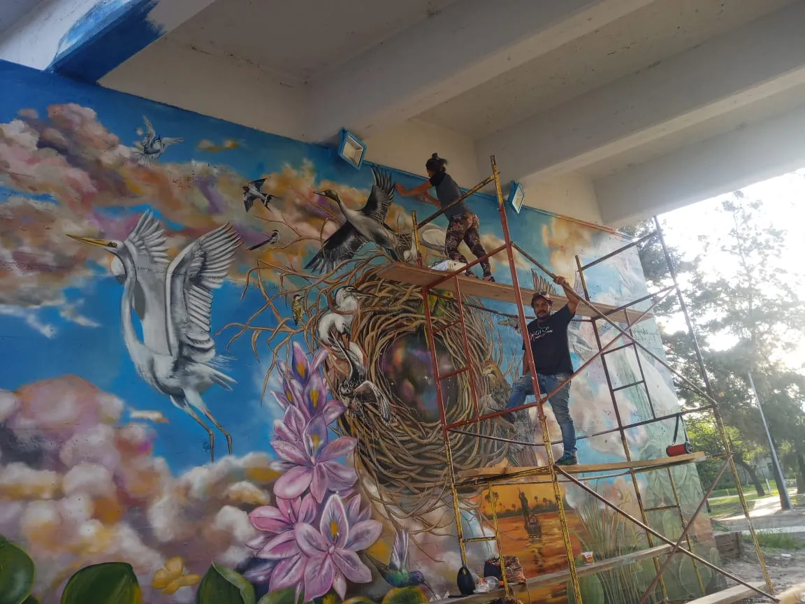 Bajo el puente de Avellaneda, uniendo barrios y ciudades, “Miradas” te invita a cruzar un umbral invisible. De un lado, una niña nativa emerge del agua, con un monito curioso en la cabeza, rodeado de flores, garzas y nubes que envuelven la escena de magia litoral. Su mirada profunda se cruza con la obra de enfrente: un gran nido, fondo de universo, donde pajaritos y aves de todos los tamaños vuelan libres por el Jaukanigáas, reserva amada, tierra regada por los abipones, de la que hoy somos parte Pero el verdadero puente es otro: es el que se teje entre quienes se animan a mirarse de verdad. Porque en este lugar, nadie es extraño. Las máscaras caen, el pecho se expande y la naturaleza —testigo silencioso— te observa, te cautiva, te invita a sentir ese escalofrío de reconocerte en el otro. “Miradas” es un llamado a ser genuino, a compartir sin miedo y a descubrir que, aunque distintos, somos iguales. Que el otro es reflejo, y que la belleza de este encuentro está en quedarse, compartir y saber que acá, nadie juzga. Solo la vida, latiendo en cada rincón, esperando que te animes a mirar… y dejarte mirar.