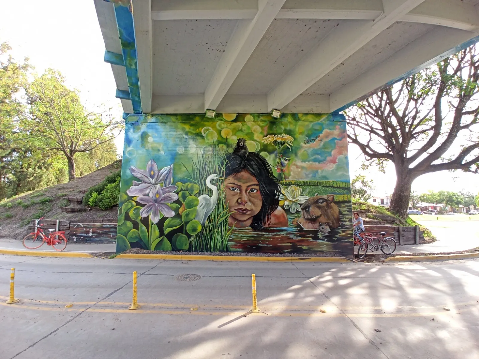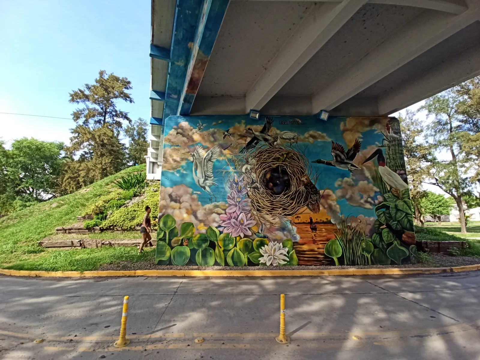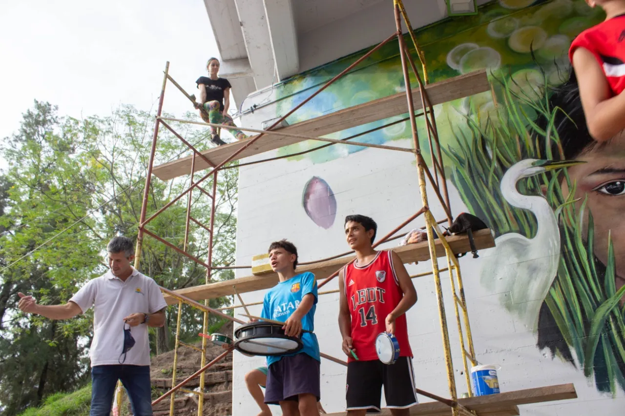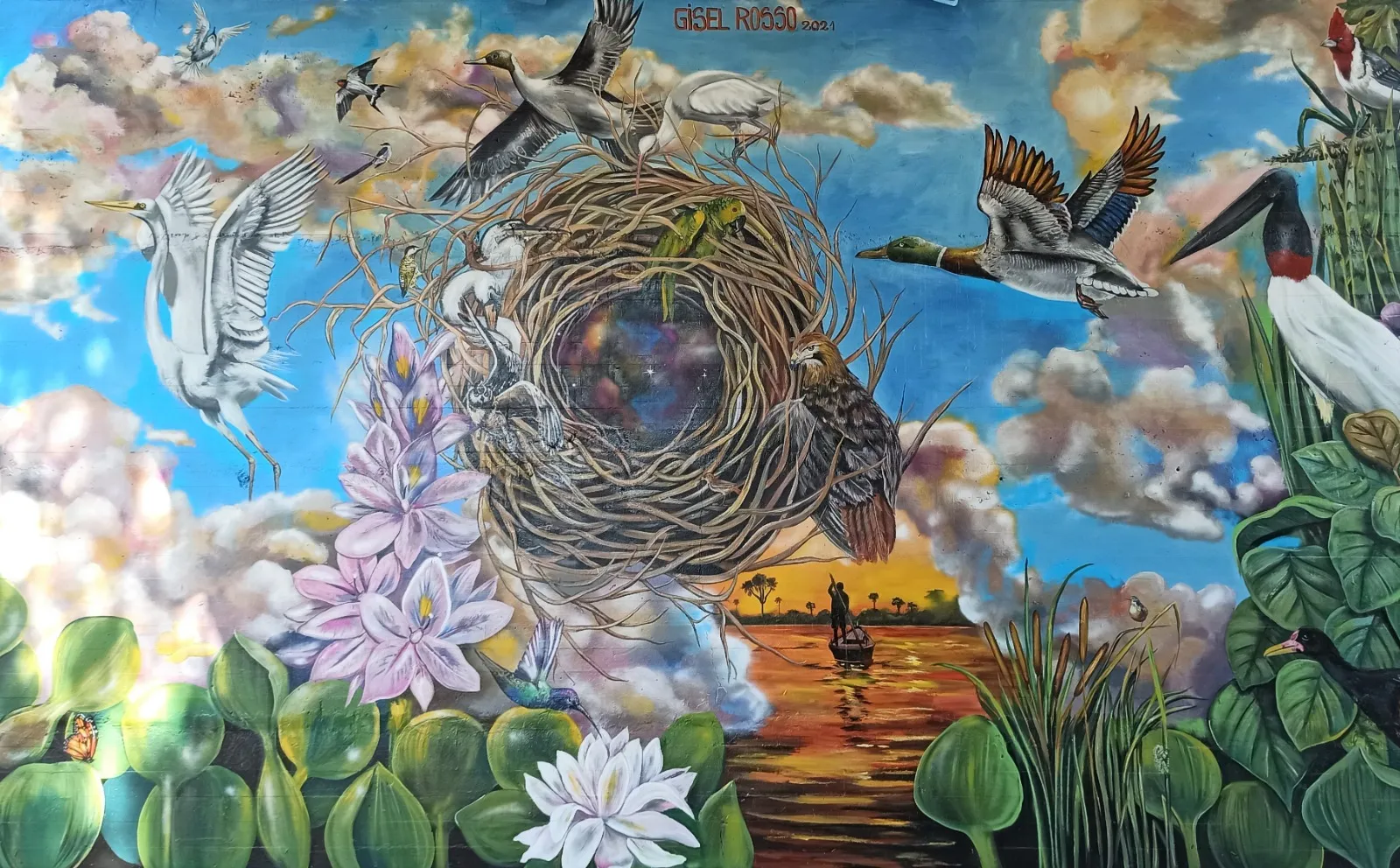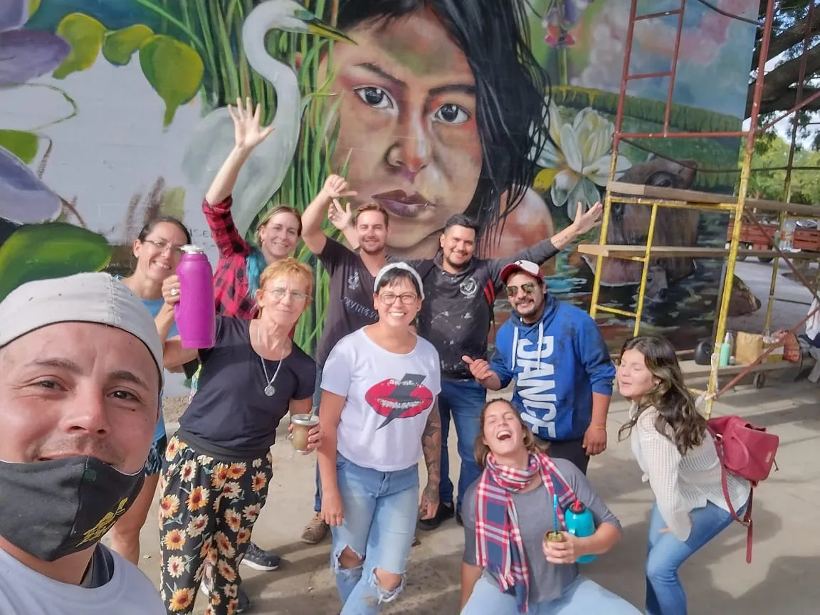Bajo el puente de Avellaneda, uniendo barrios y ciudades, “Miradas” te invita a cruzar un umbral invisible. De un lado, una niña nativa emerge del agua, con un monito curioso en la cabeza, rodeado de flores, garzas y nubes que envuelven la escena de magia litoral. Su mirada profunda se cruza con la obra de enfrente: un gran nido, fondo de universo, donde pajaritos y aves de todos los tamaños vuelan libres por el Jaukanigáas, reserva amada, tierra regada por los abipones, de la que hoy somos parte Pero el verdadero puente es otro: es el que se teje entre quienes se animan a mirarse de verdad. Porque en este lugar, nadie es extraño. Las máscaras caen, el pecho se expande y la naturaleza —testigo silencioso— te observa, te cautiva, te invita a sentir ese escalofrío de reconocerte en el otro. “Miradas” es un llamado a ser genuino, a compartir sin miedo y a descubrir que, aunque distintos, somos iguales. Que el otro es reflejo, y que la belleza de este encuentro está en quedarse, compartir y saber que acá, nadie juzga. Solo la vida, latiendo en cada rincón, esperando que te animes a mirar… y dejarte mirar.