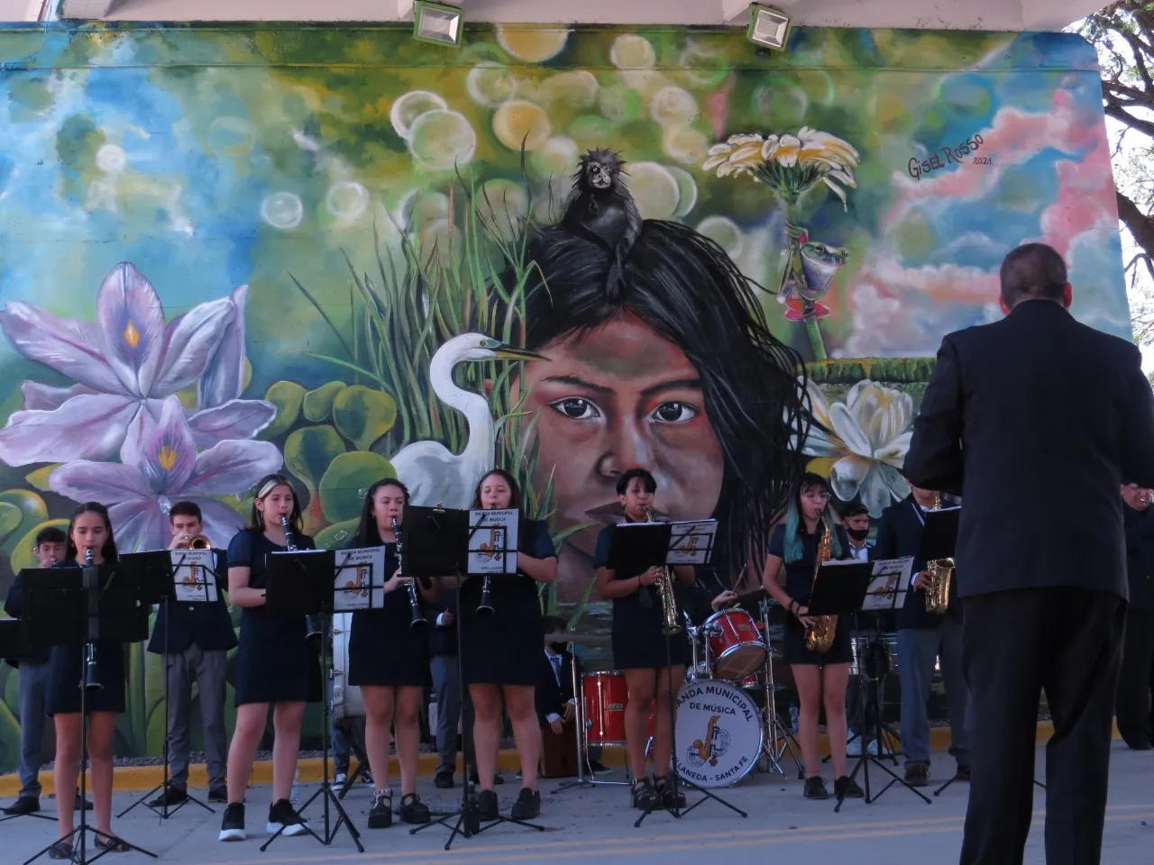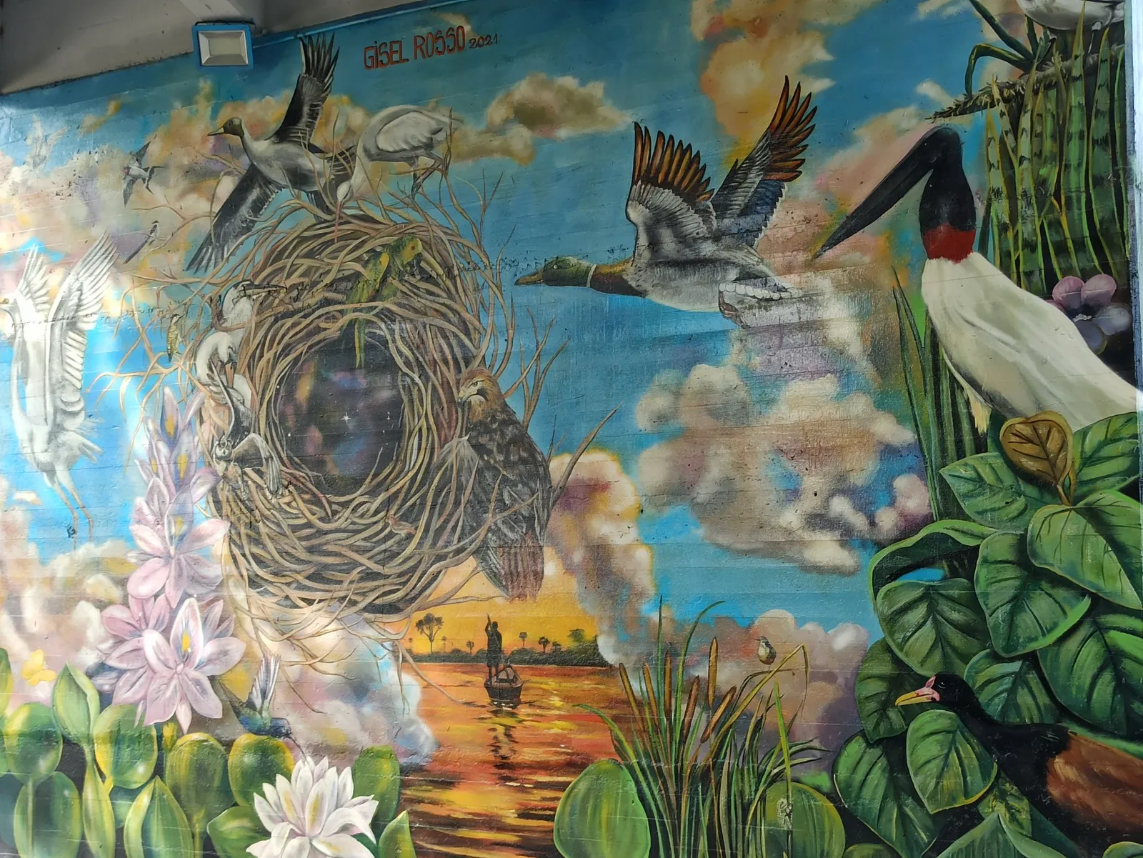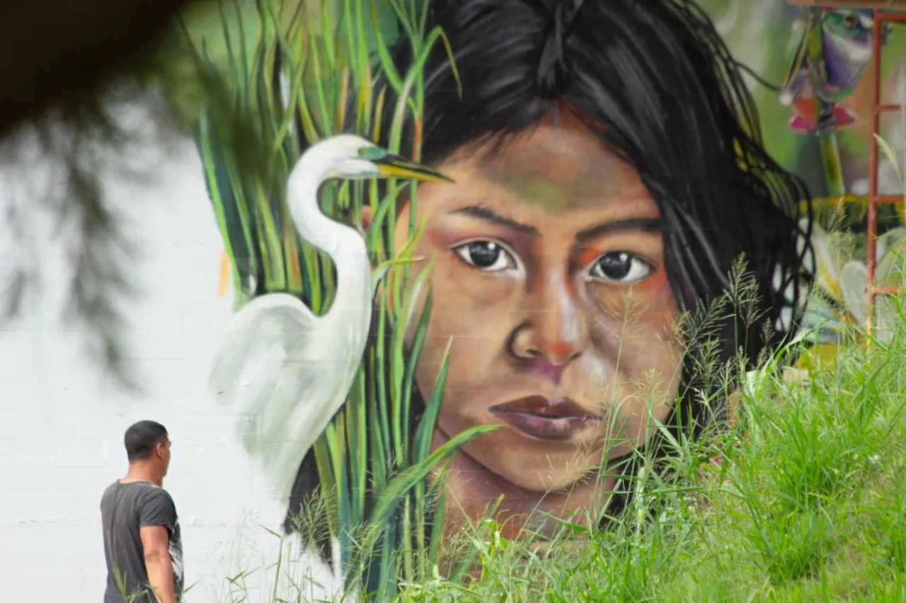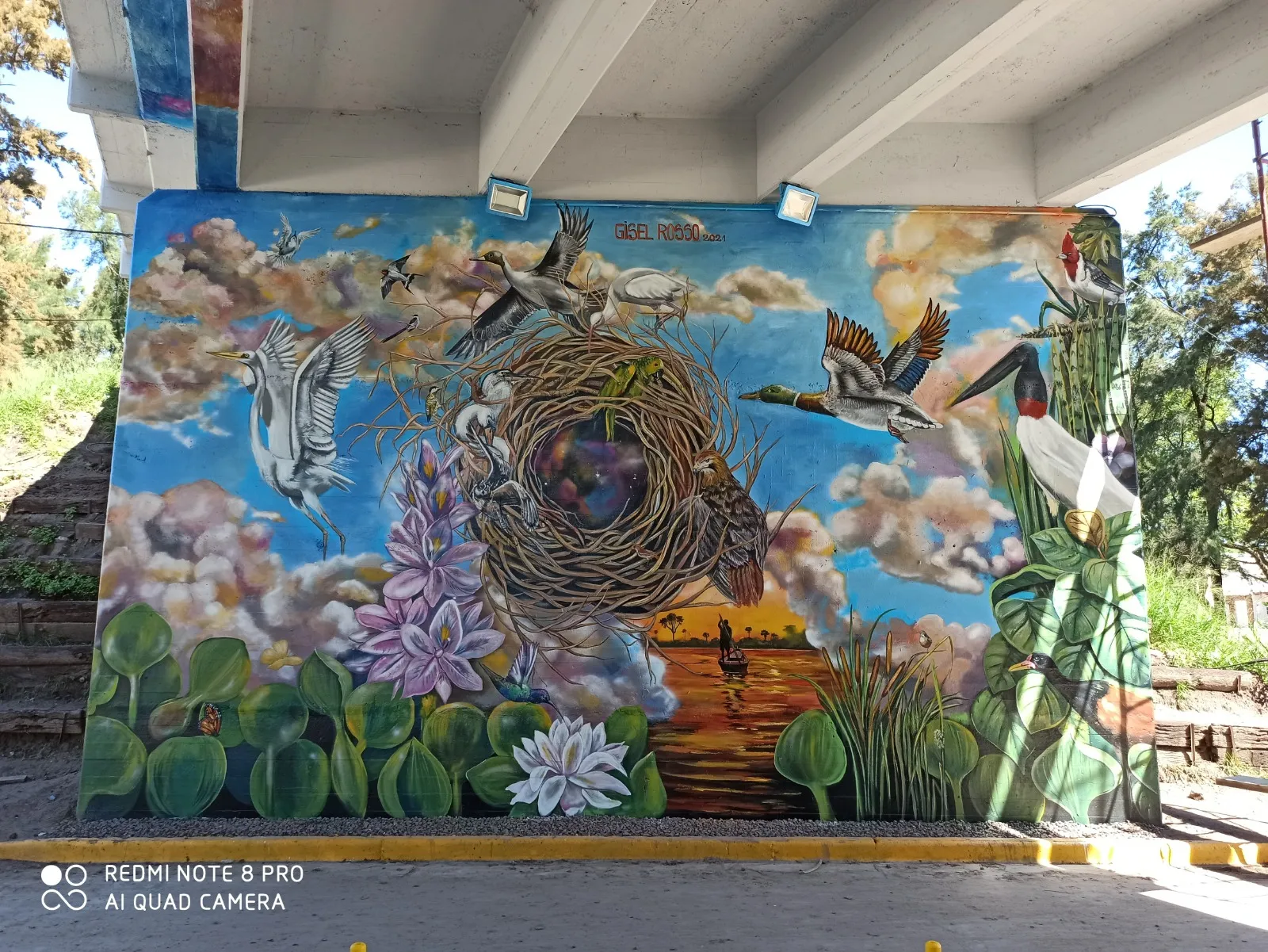 Bajo el puente de Avellaneda, uniendo barrios y ciudades, “Miradas” te invita a cruzar un umbral invisible. De un lado, una niña nativa emerge del agua, con un monito curioso en la cabeza, rodeado de flores, garzas y nubes que envuelven la escena de magia litoral. Su mirada profunda se cruza con la obra de enfrente: un gran nido, fondo de universo, donde pajaritos y aves de todos los tamaños vuelan libres por el Jaukanigáas, reserva amada, tierra regada por los abipones, de la que hoy somos parte Pero el verdadero puente es otro: es el que se teje entre quienes se animan a mirarse de verdad. Porque en este lugar, nadie es extraño. Las máscaras caen, el pecho se expande y la naturaleza —testigo silencioso— te observa, te cautiva, te invita a sentir ese escalofrío de reconocerte en el otro. “Miradas” es un llamado a ser genuino, a compartir sin miedo y a descubrir que, aunque distintos, somos iguales. Que el otro es reflejo, y que la belleza de este encuentro está en quedarse, compartir y saber que acá, nadie juzga. Solo la vida, latiendo en cada rincón, esperando que te animes a mirar… y dejarte mirar.