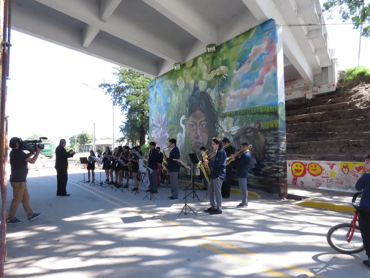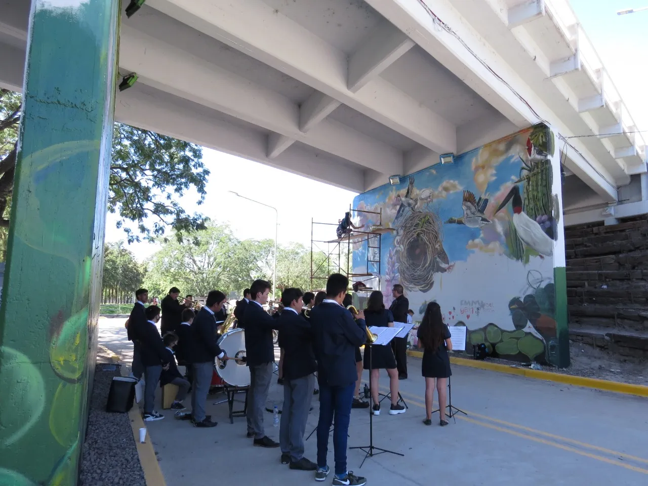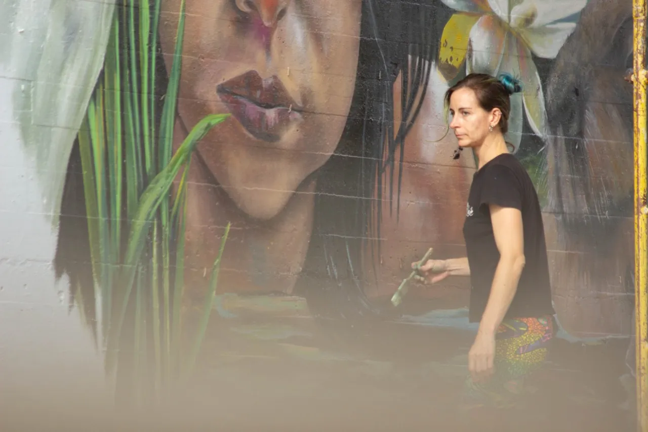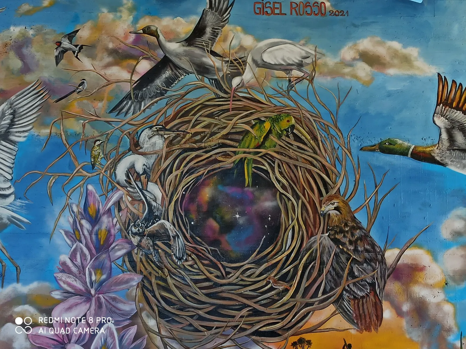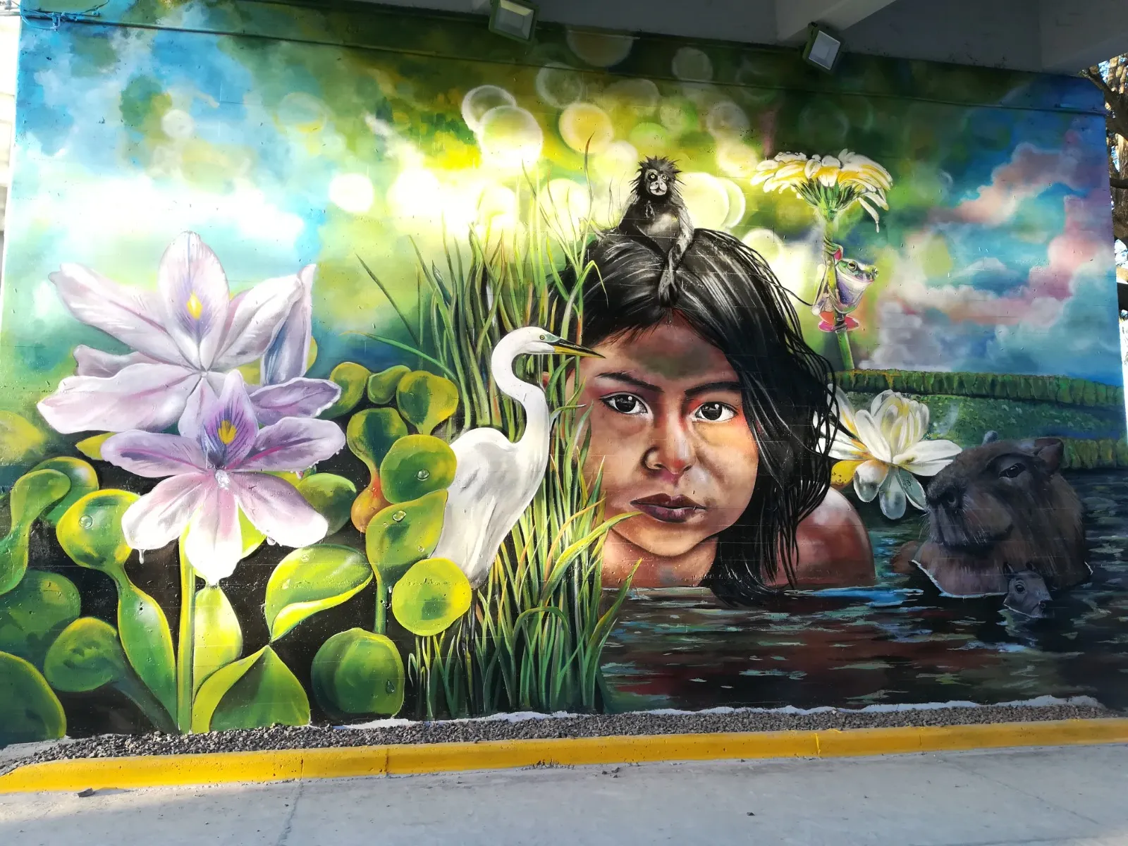 Bajo el puente de Avellaneda, uniendo barrios y ciudades, “Miradas” te invita a cruzar un umbral invisible. De un lado, una niña nativa emerge del agua, con un monito curioso en la cabeza, rodeado de flores, garzas y nubes que envuelven la escena de magia litoral. Su mirada profunda se cruza con la obra de enfrente: un gran nido, fondo de universo, donde pajaritos y aves de todos los tamaños vuelan libres por el Jaukanigáas, reserva amada, tierra regada por los abipones, de la que hoy somos parte Pero el verdadero puente es otro: es el que se teje entre quienes se animan a mirarse de verdad. Porque en este lugar, nadie es extraño. Las máscaras caen, el pecho se expande y la naturaleza —testigo silencioso— te observa, te cautiva, te invita a sentir ese escalofrío de reconocerte en el otro. “Miradas” es un llamado a ser genuino, a compartir sin miedo y a descubrir que, aunque distintos, somos iguales. Que el otro es reflejo, y que la belleza de este encuentro está en quedarse, compartir y saber que acá, nadie juzga. Solo la vida, latiendo en cada rincón, esperando que te animes a mirar… y dejarte mirar.