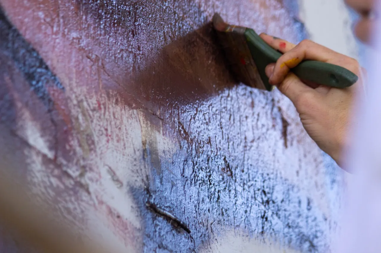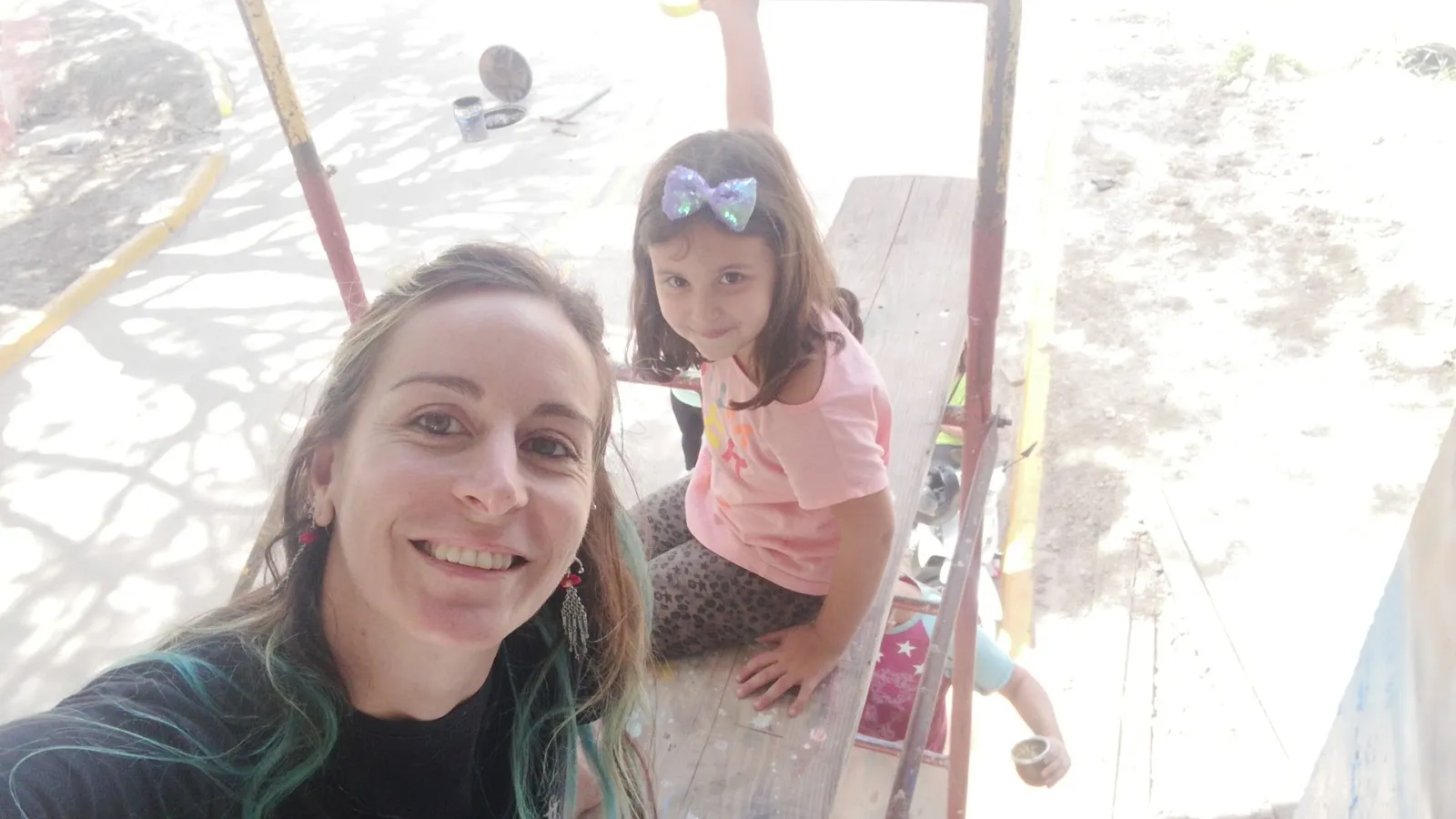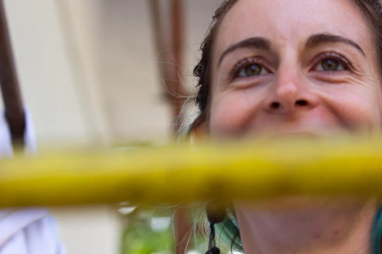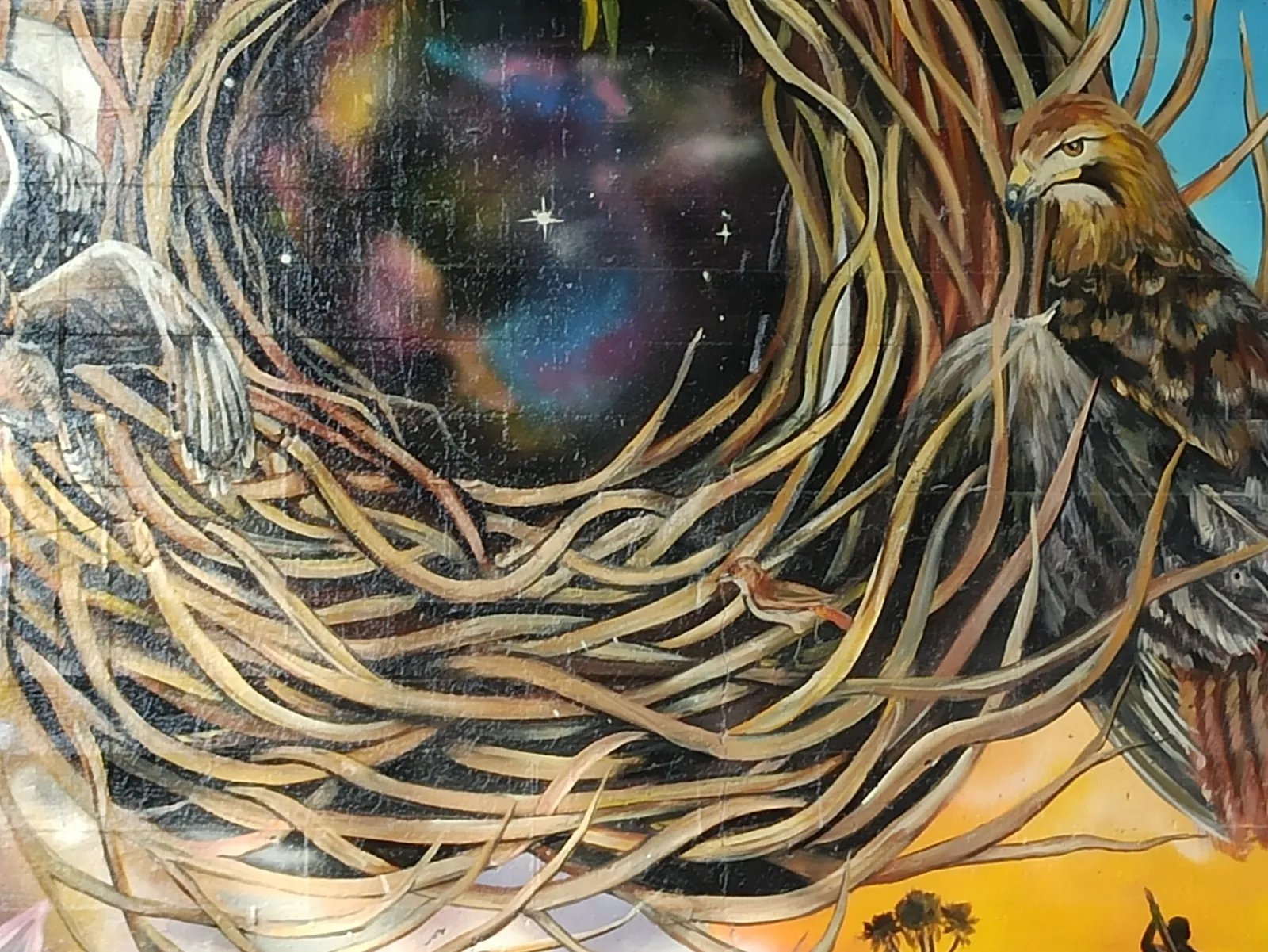 Bajo el puente de Avellaneda, uniendo barrios y ciudades, “Miradas” te invita a cruzar un umbral invisible. De un lado, una niña nativa emerge del agua, con un monito curioso en la cabeza, rodeado de flores, garzas y nubes que envuelven la escena de magia litoral. Su mirada profunda se cruza con la obra de enfrente: un gran nido, fondo de universo, donde pajaritos y aves de todos los tamaños vuelan libres por el Jaukanigáas, reserva amada, tierra regada por los abipones, de la que hoy somos parte Pero el verdadero puente es otro: es el que se teje entre quienes se animan a mirarse de verdad. Porque en este lugar, nadie es extraño. Las máscaras caen, el pecho se expande y la naturaleza —testigo silencioso— te observa, te cautiva, te invita a sentir ese escalofrío de reconocerte en el otro. “Miradas” es un llamado a ser genuino, a compartir sin miedo y a descubrir que, aunque distintos, somos iguales. Que el otro es reflejo, y que la belleza de este encuentro está en quedarse, compartir y saber que acá, nadie juzga. Solo la vida, latiendo en cada rincón, esperando que te animes a mirar… y dejarte mirar.