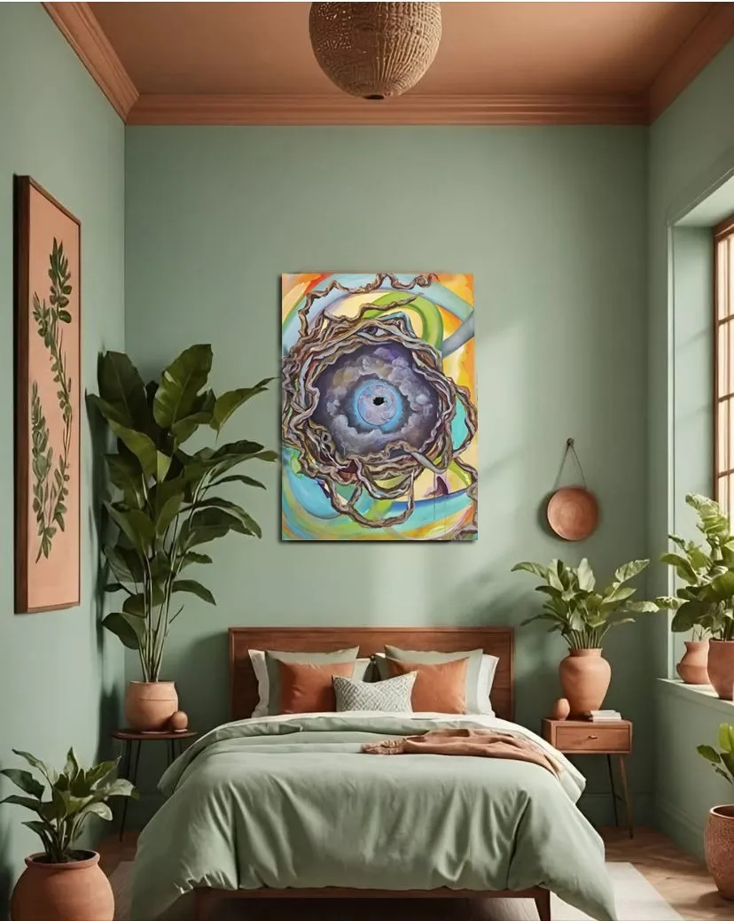 Los colores vibrantes y orgánicos laten como la tierra después de la lluvia, invitándote a recordar que sos parte de algo más grande, que tus raíces y las del mundo se entrelazan en un mismo pulso.