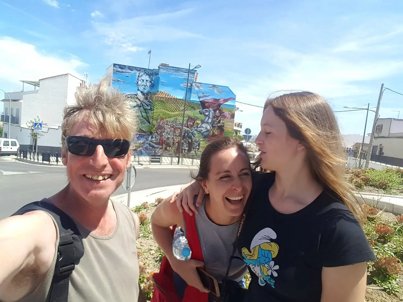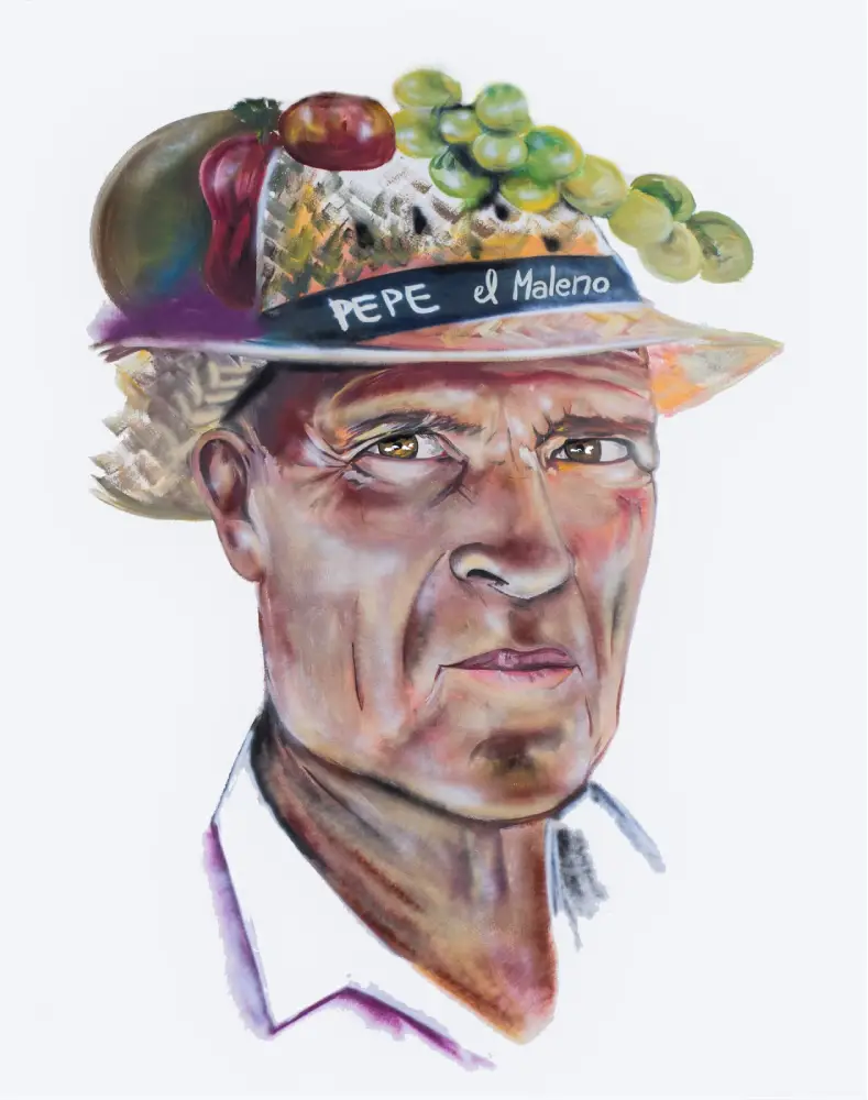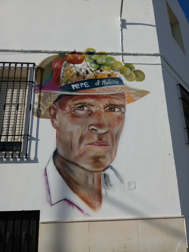 Me encontraba pintando y compartiendo en esta tierra, experimentando una hermandad maravillosa con cosecheros de uva que se reunían todos los días en el bar al lado del mural. Un día entre charlas, risas y charlas surgió la idea de retratar, desde una gratitud que todos sentían a Pepe el Maleno, un vecino querido del barrio, de mirada profunda y transparente, que había contribuido con muchos jóvenes, dándoles trabajo, cuando quizás ya nadie confiaba en ellos, esos jóvenes y muchos pidieron el retrato frente al bar de Pepe el Maleno en símbolo de Gratitud. Hecho está, con gran goce, la aventura de ese día.