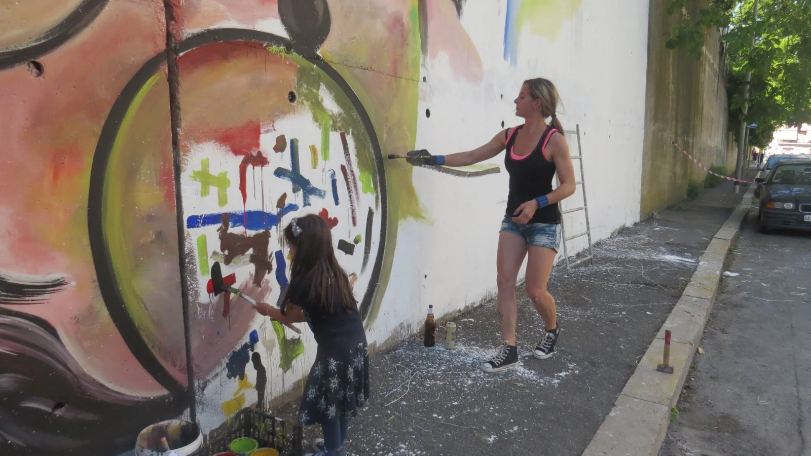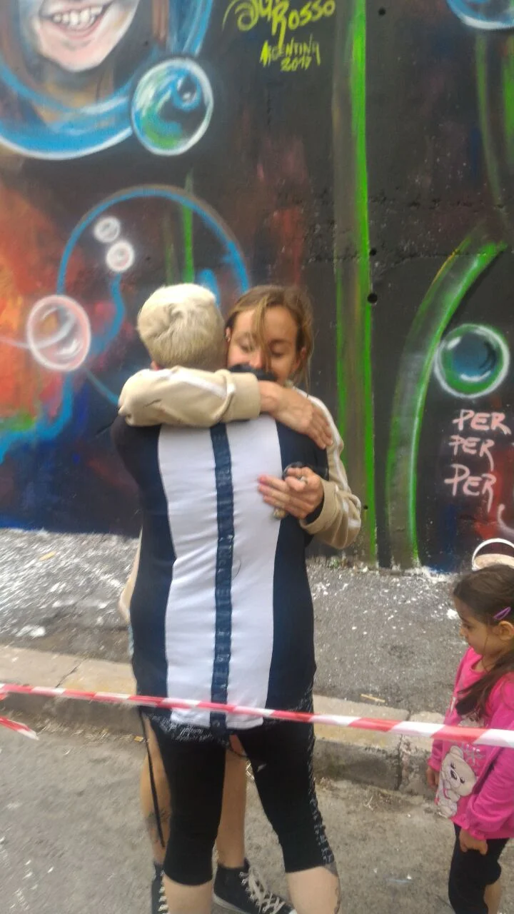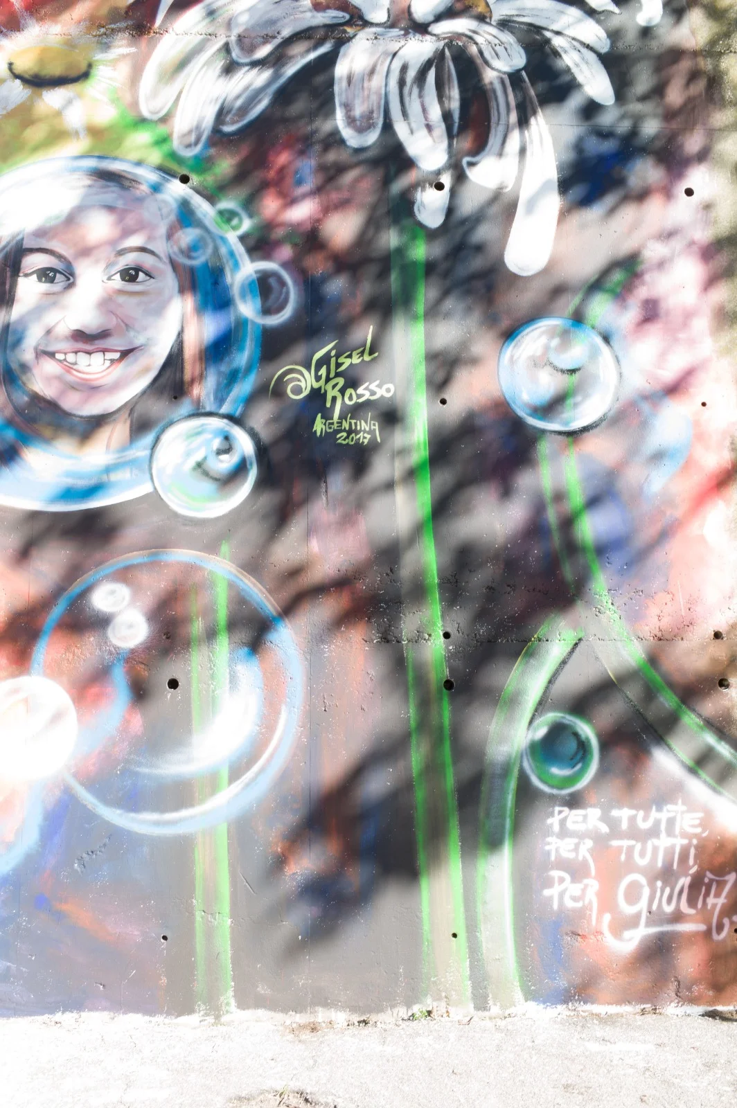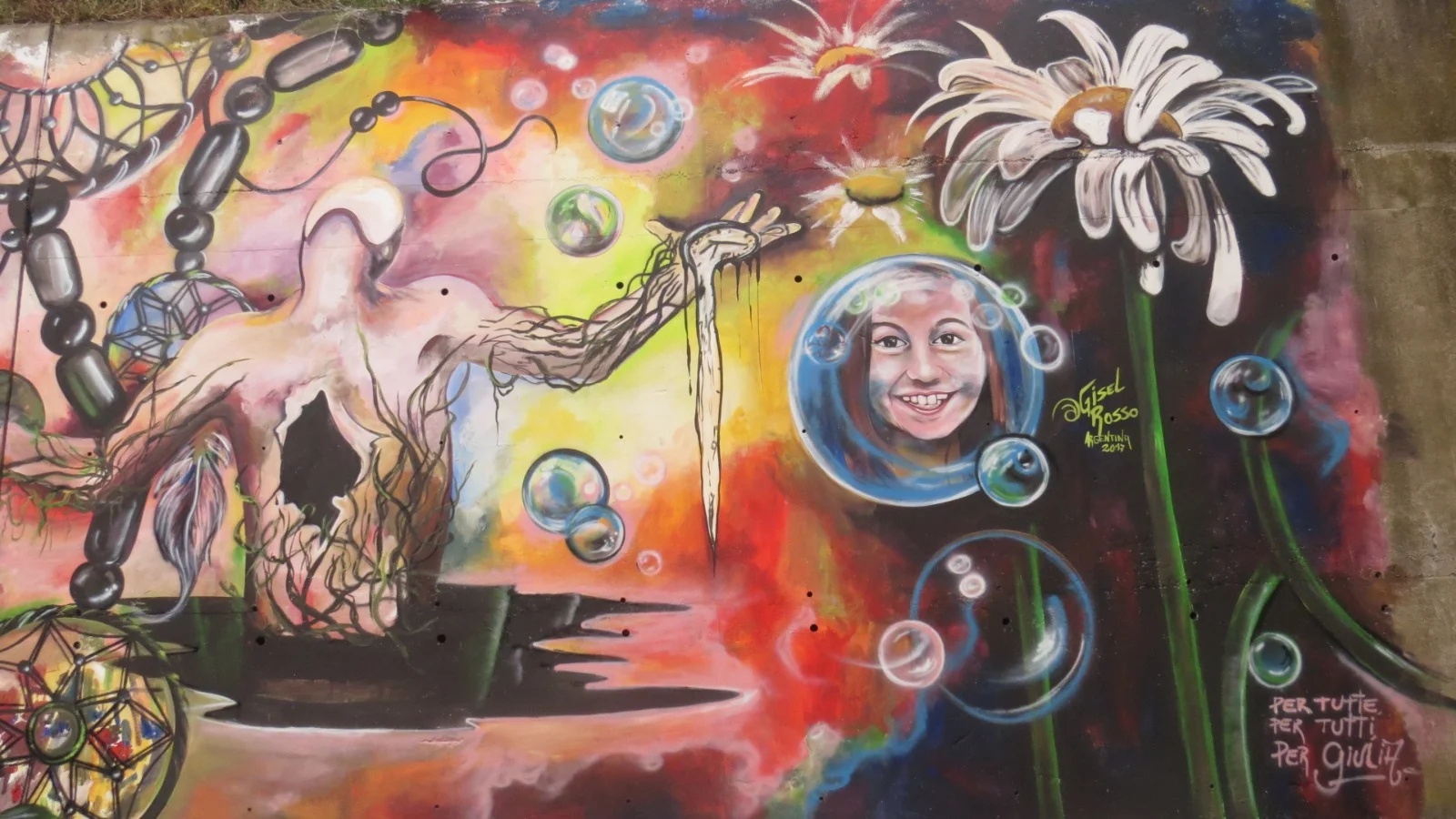 Estando en Roma, entre charlas con amigos, surge la propuesta de hacer en el barrio “el mamut” un homenaje a Giulia. Una niña que falleció en un terremoto, encontrandola en su búsqueda, abrazada a su hermanita menor, la cual vivió, y pintó junto a todos los vecinos del barrio,